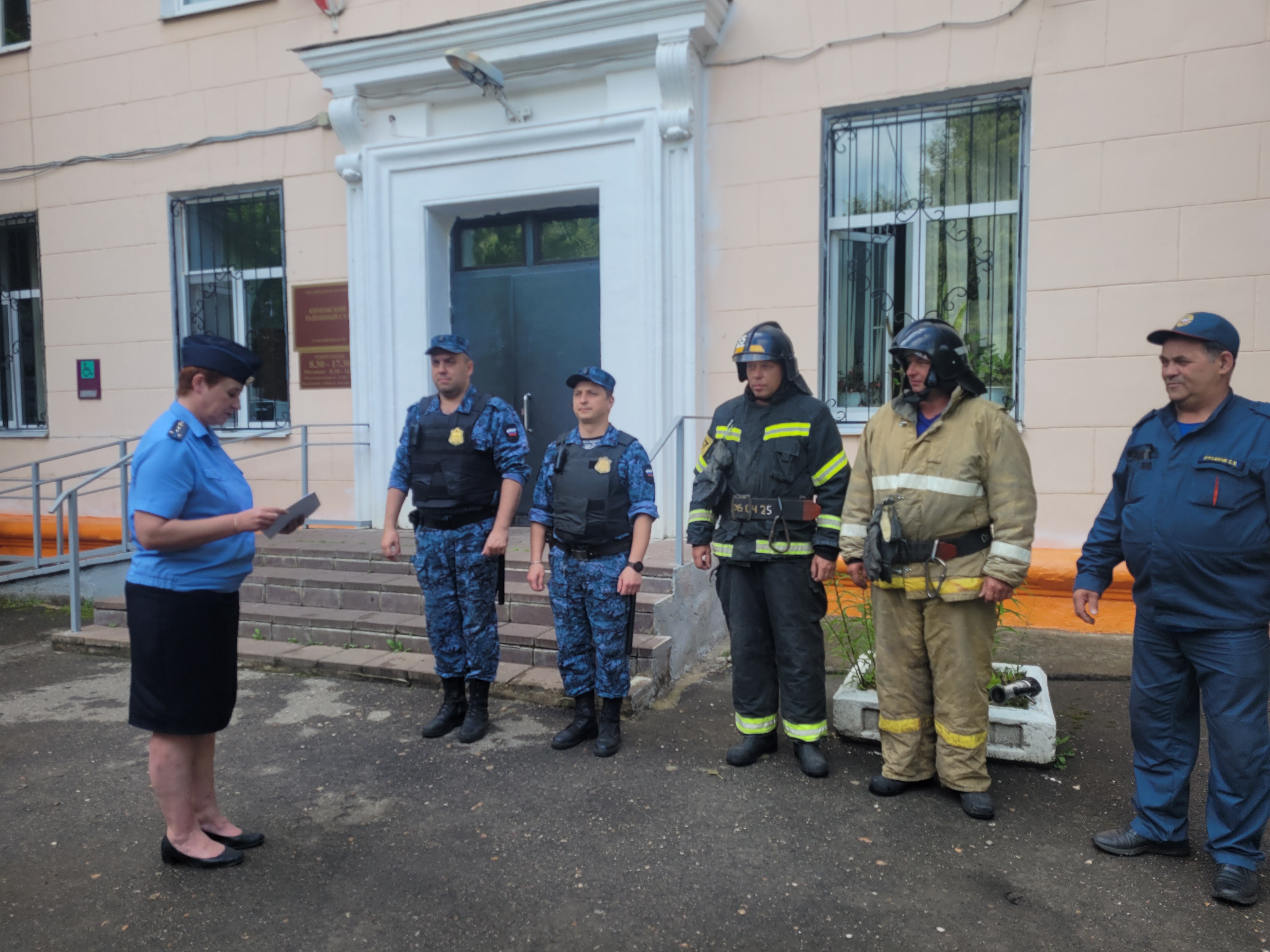 В соответствии с Планом специальной подготовки работников Управления ФССП России по Тульской области на второе полугодие 2025 года в здании Кимовского районного суда 18.07.2025 в период с 13-00 до 13-50 часов проведена тренировка по теме «Действия при возникновении возгорания или пожара в зданиях суда и судебных участков мировых судей». На тренировку привлекались: судебные приставы по ОУПДС – 2 человека; сотрудники Кимовского гарнизона пожарной охраны – 3 человека. В ходе проведения тренировки отработаны следующие основные учебные вопросы: - организация действий при возникновении возгорания или пожара в зданиях суда и судебных участков мировых судей; - порядок действий при возникновении возгорания или пожара в зданиях суда и судебных участков мировых судей.